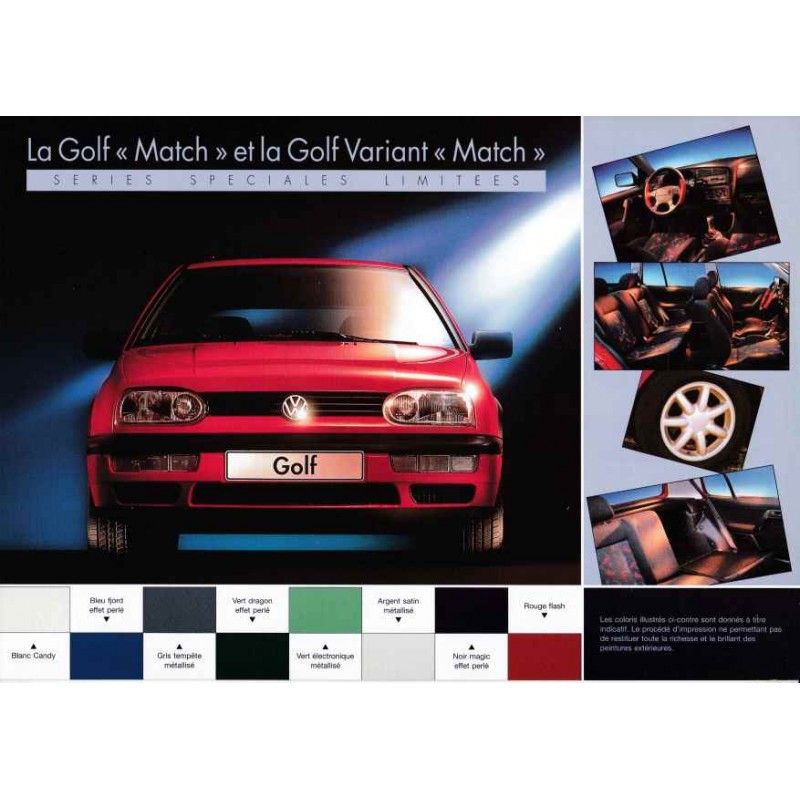 Contenu : VW Golf / Variant Match, 1390 cm3 60 ch / 1781 cm3 90 ch / SDI 1896 cm3 64 ch / Turbo Diesel 1896 cm3 75 ch / TDI 1896 cm3 90 ch, caractéristiques sommaires, équipements, coloris, prix