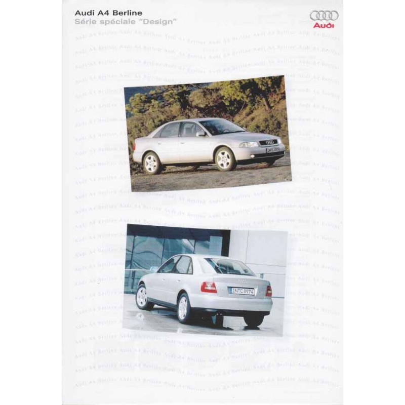 Contenu / Content : Audi A4 Design 1,6 1595 cm3 102 ch / 1,8 20V 1781 cm3 125 ch / 1,8 20V Turbo / Quattro 1781 cm3 150 ch / V6 2,4 30V 2393 cm3 163 ch / V6 2,8 30V Quattro 2771 cm3 193 ch / / 1,9 TDI 1896 cm3 90 ch / 1,9 TDI 1896 cm3 115 ch / 2,5 TDI 2496 cm3 150 ch, caractéristiques sommaires, équipements, prix