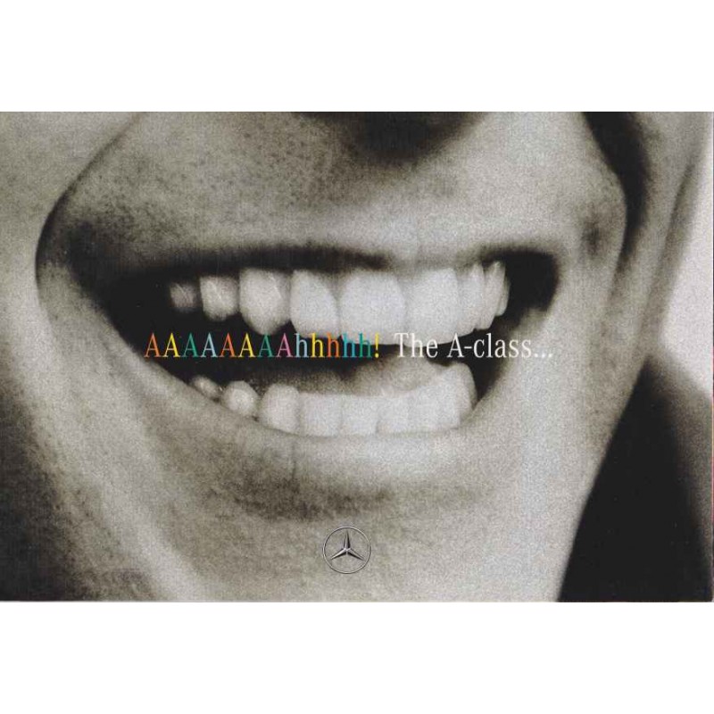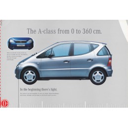 Contenu : Mercedes A, dépliant de teasing (long de 3,60 m une fois déplié!), six mois avant le lancement, A140 1,4 l 82 ch / A160 1,6 l 102 ch / A170D 1,7 l 60 ch / A170 Turbo D 1,7 l 90 ch, caractéristiques sommaires, coloris