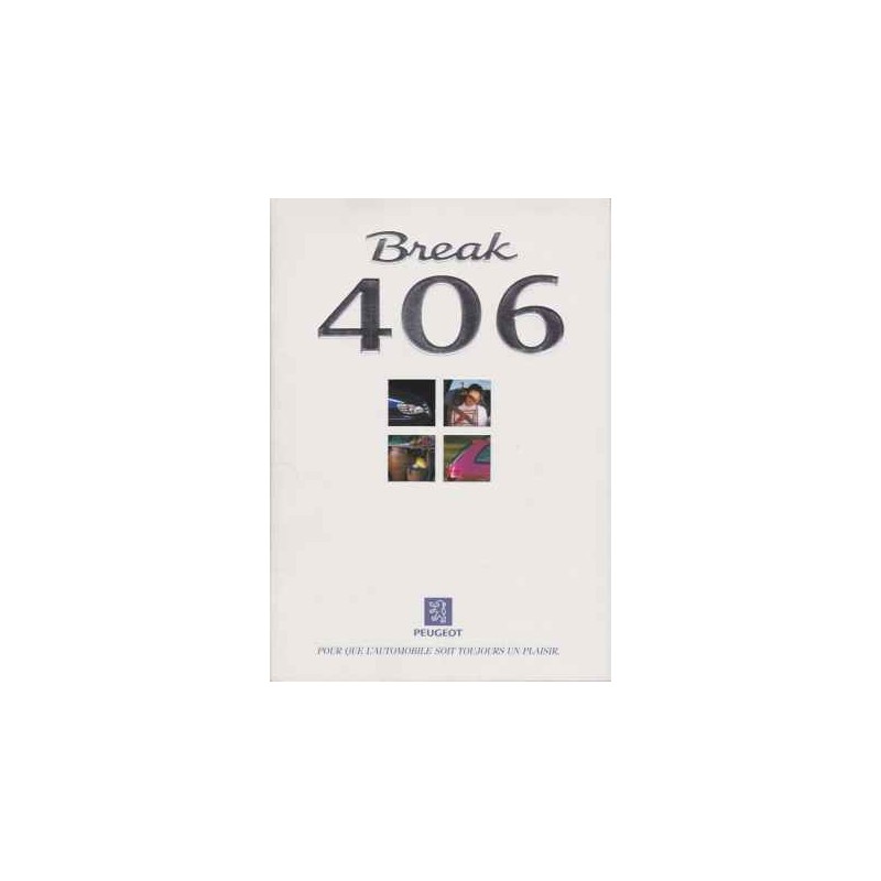 Contenu : Peugeot 406 Break SR/ST 1761 cm3 112 ch / ST/SV 1998 cm3 135 ch / SV Turbo 1998 cm3 150 ch / SVE 2946 cm3 194 ch / Diesel Turbo SR 1905 cm3 75 ch / SR/ST 1905 cm3 90 ch / ST/SV 2088 cm3 110 ch, caractéristiques, équipements, coloris, avec dépliant caractéristiques