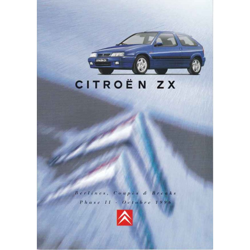 Contenu : Citroen ZX Berline / Coupé / Break X / SX / Exclusive / Volcane 1124 cm3 60 ch / 1360 cm3 75 ch / 1580 cm3 90 ch / 1761 cm3 103 ch / 1761 cm3 112 ch / 1998 cm3 123 ch / 16V 1998 cm3 167 ch / D 1905 cm3 68 ch / Turbo D 1905 cm3 90 ch, caractéristiques, équipements, coloris avec dépliant caractéristiques