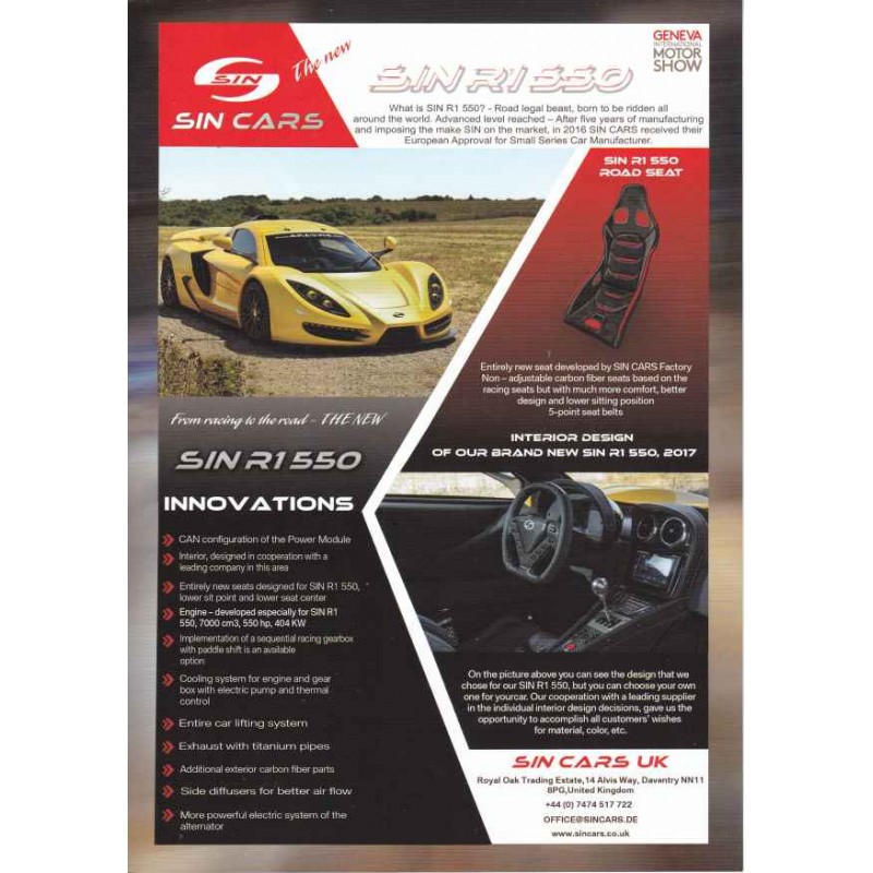 Contenu : SIN R1 550, 7,0 l 550 ch / GT4, moteur Chevrolet V8 LS3 6,2 l 430 ch, caractéristiques